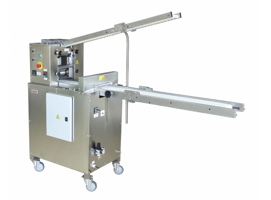 • Teja de entrada de masa de rodillos, regulable en altura.