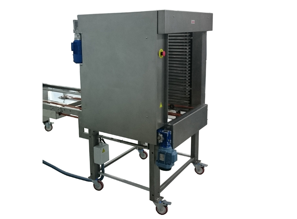 Con éste sistema, acoplable a nuestras máquinas formadoras de colines y similares, es posible reducir la mano de obra, ya que las bandejas se van almacenando hasta ser retiradas, también es posible instalarlo a la entrada de la máquina para depositar bandejas vacías.