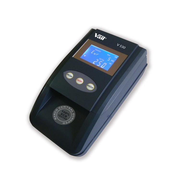 El detector de Billetes VAIL V 530 es un dispositivo desarrollado con la más moderna tecnología para la comprobación de la autenticidad de todos los billetes de Euro y Libra Esterlina.