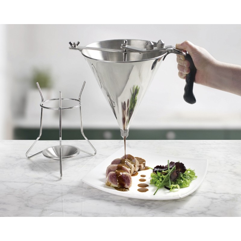 El soporte incluido proporciona estabilidad durante su uso, evitando movimientos indeseados y facilitando un acceso rápido y seguro al dosificador. Esto es especialmente útil en cocinas y pastelerías con alta demanda, donde la eficiencia y la rapidez en el proceso de elaboración son fundamentales. El soporte incluye un platillo anti-goteo.