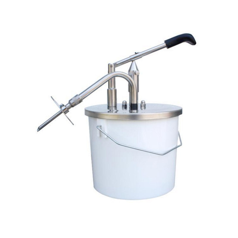 Su estructura robusta y funcional combina materiales de alta calidad: una tapa de acero inoxidable, resistente a la corrosión y de fácil limpieza, junto con un cubo de plástico alimentario ligero, duradero y apto para un uso intensivo en entornos profesionales. El caño de salida orientado hacia arriba está diseñado para facilitar una dosificación precisa, permitiendo trabajar con diferentes tipos de cremas, desde las más ligeras hasta las más densas, sin esfuerzo ni desperdicio.