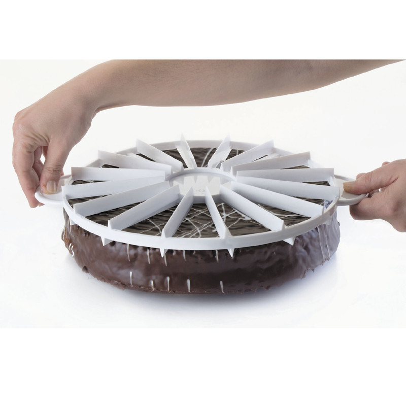 Este marcador es perfecto para dividir tartas clásicas, bizcochos, tortas semifrías, pasteles de cumpleaños, tartas mousse y elaboraciones con coberturas delicadas. El marcado previo permite realizar cortes limpios sin dañar la estructura del producto, garantizando un acabado impecable y completamente profesional.