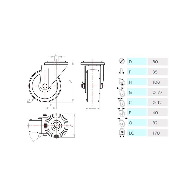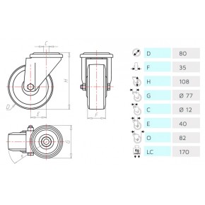 Rueda para carros giratoria con agujero diámetro 80 mm.