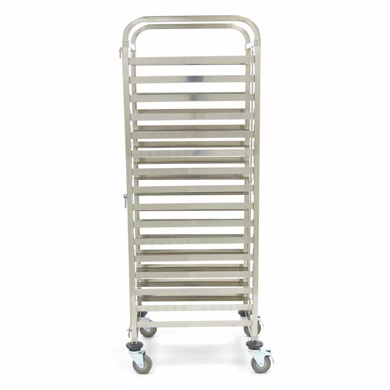 El carro bandejero inoxidable desmontable con 16 pisos es la solución perfecta para el transporte, almacenamiento y enfriado de bandejas en entornos profesionales de panadería, pastelería, hostelería y restauración. Fabricado íntegramente en acero inoxidable de alta calidad, este carro garantiza la máxima resistencia, durabilidad e higiene, cumpliendo con las exigencias del trabajo diario en obradores y cocinas profesionales.