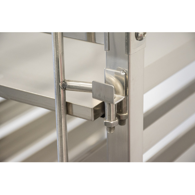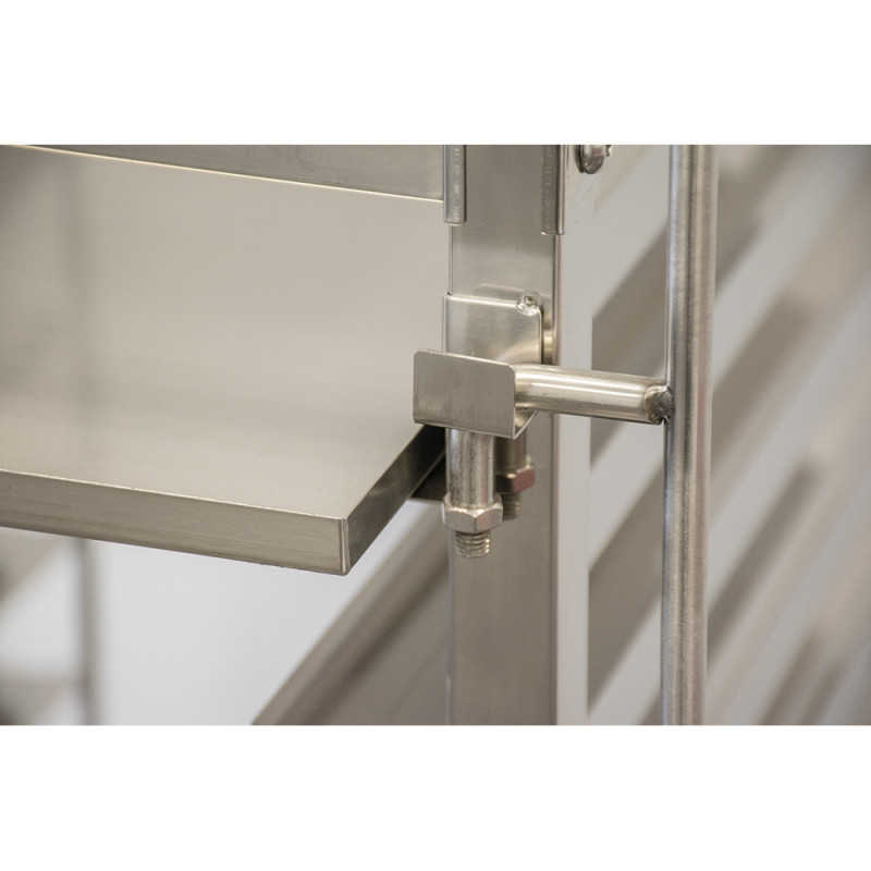 Gracias a su construcción robusta y estable, el carro bandejero soporta un uso intensivo sin deformaciones. Las guías perfectamente soldadas aseguran un deslizamiento suave de las bandejas, mientras que las ruedas giratorias, dos de ellas con freno, proporcionan una excelente movilidad y estabilidad durante el servicio o en el obrador.