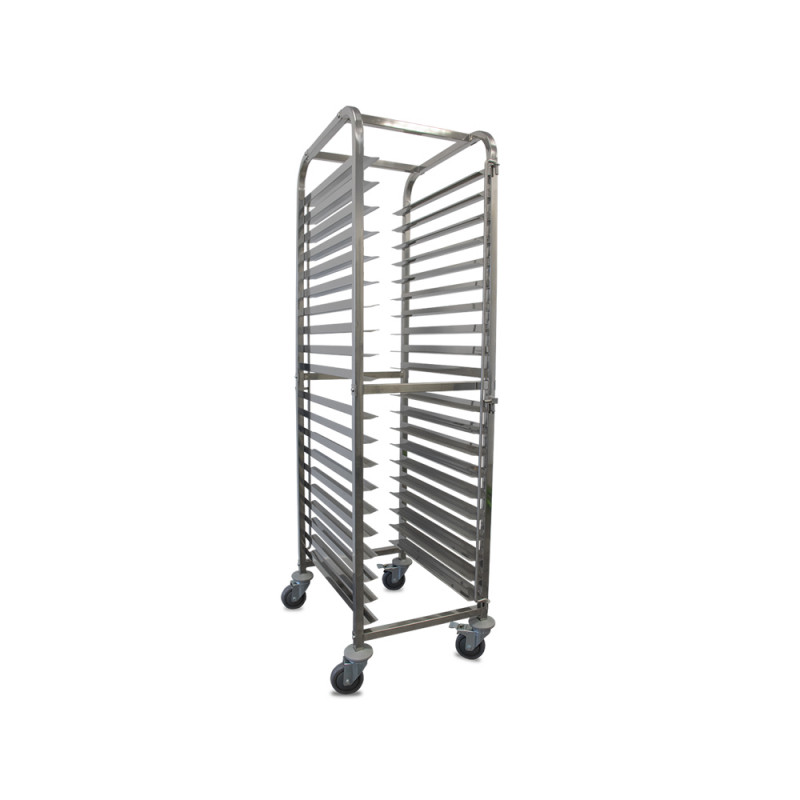 El carro bandejero inoxidable desmontable con 20 pisos es la solución perfecta para el transporte, almacenamiento y enfriado de bandejas en entornos profesionales de panadería, pastelería, hostelería y restauración. Fabricado íntegramente en acero inoxidable de alta calidad, este carro garantiza la máxima resistencia, durabilidad e higiene, cumpliendo con las exigencias del trabajo diario en obradores y cocinas profesionales.