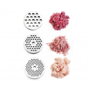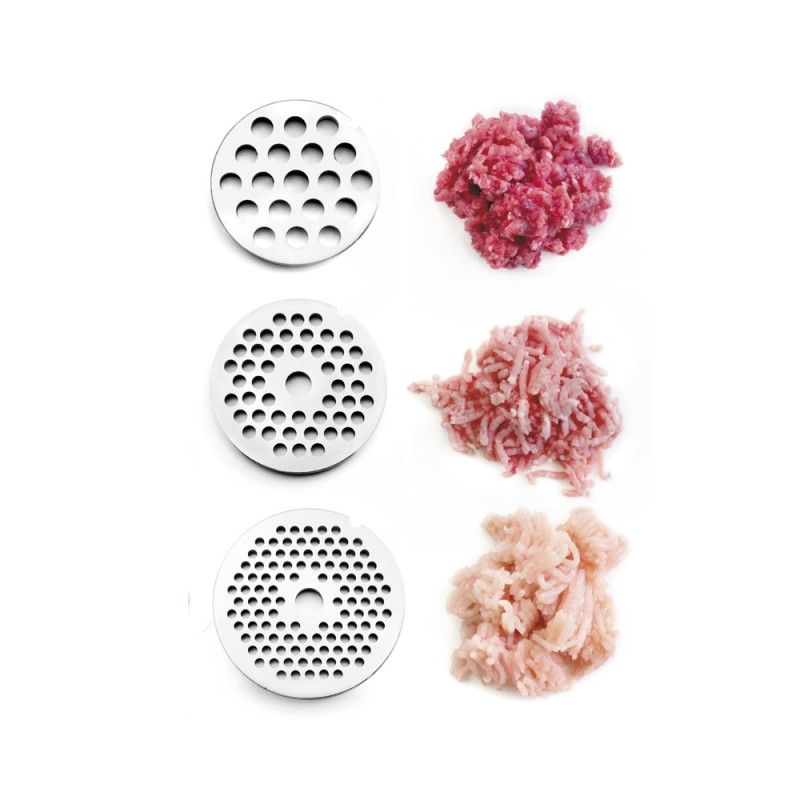 Equipada con tres discos perforados de diferentes diámetros (Ø3-5-8 mm), esta picadora permite seleccionar el grosor del picado según la preparación deseada, desde carne fina para rellenos o embutidos hasta cortes más gruesos para preparaciones artesanales. Su sistema de corte de acero inoxidable mantiene el filo por más tiempo y garantiza una molienda uniforme, conservando la textura y las propiedades de los alimentos. Además, incluye 4 accesorios extra para embutidos (Kibbe incluido).