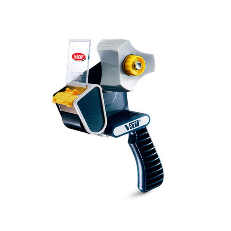Aplicador manual para cinta adhesiva de hasta 50mm. de ancho, equipada con freno regulable y fabricado con doble cuerpo de plástico y de metal., que facilita la colocación de la cinta adhesiva y permite una buena tensión.