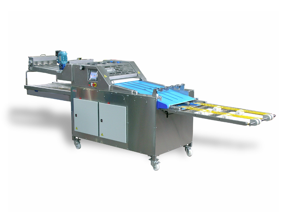 Machine for the manufacture of oval regañá. Laminate, chop and place the product on the tray, synchronizing the product before depositing it on the tray.